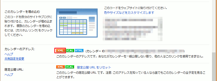 - 下のほうにカレンダーのアドレスがあるので、XMLアイコンをクリックします。