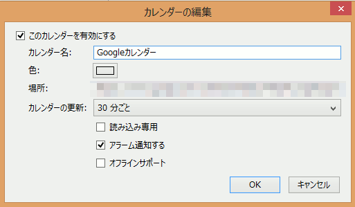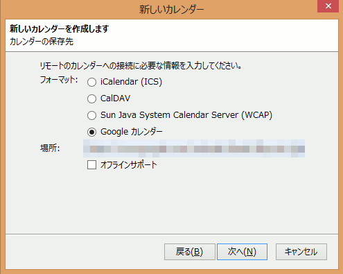 - Googleカレンダーを選び、上記でXMLアイコンを押して取得したURLを場所のテキストフィールドに貼り付けます。