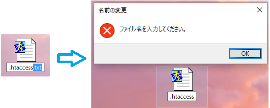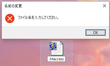 - デスクトップ上で右クリック、新規作成でテキストファイルを作成し、ドットから始まるファイル名に変更するとエラーとなります。
