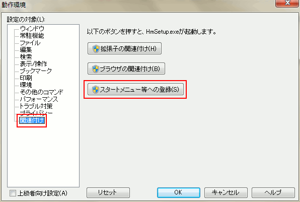 - スタートメニュー等への登録(S)ボタンををクリックします。
