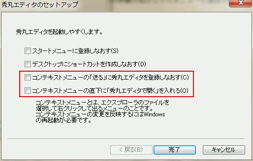 - 秀丸エディタのセットアップ画面が表示されるので、チェックボックスにチェックを入れ完了ボタンを押します。