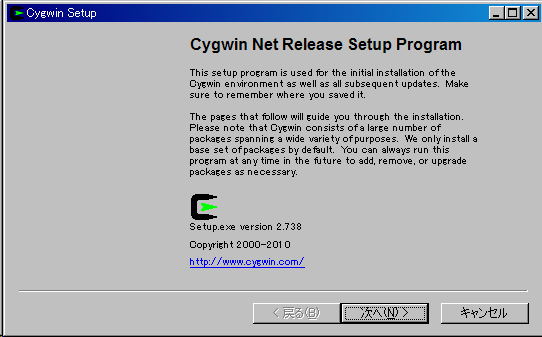 - Cygwinのsetup.exeが起動した最初の画面