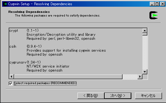 依存関係のあるパッケージがないと動かないので''Select required packages (RECOMMENDED)にチェックがされていることを確認し、次へ(N)ボタンをクリックします。