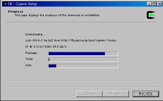 - 選択したパッケージがインストール中(ダウンロード中)を示すProgress画面です。