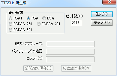 - 生成ボタンを押すと鍵のパスフレーズとコメントに入力が可能になります。