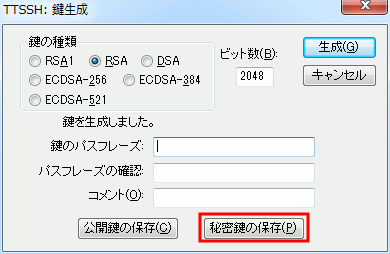 - 鍵の種類およびビット数を設定します。(当方初期値のまま使用しました。)