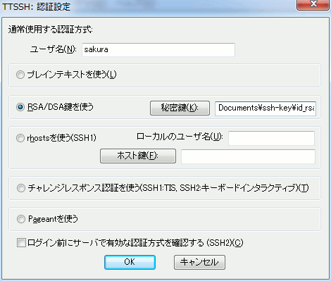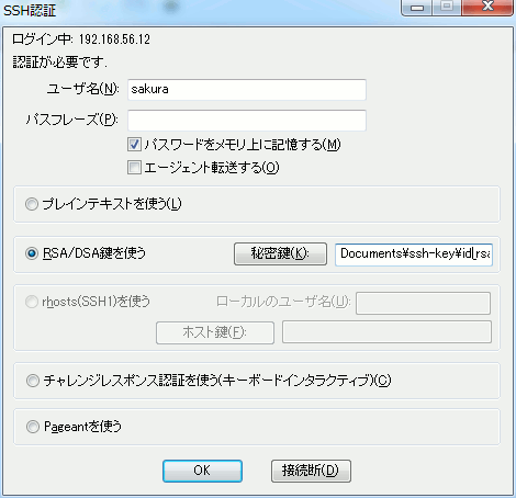 - RSA/DSA鍵を使うをチェックし秘密鍵ボタンを押して、鍵生成の時に保存したid_rsaを選択します。