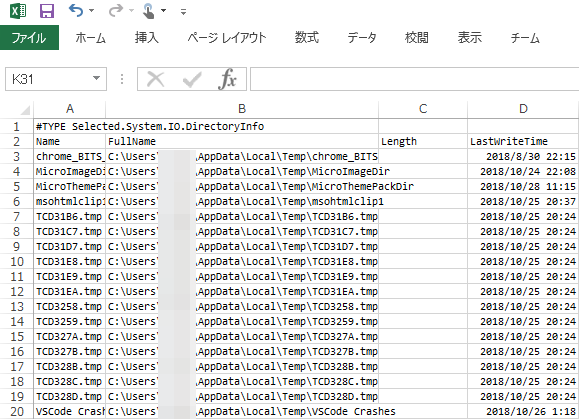Name FullName ---- -------- <省略> TCD31B6.tmp C:\Users\sakura\AppData\Local\Temp\TCD31B6.tmp TCD31C7.tmp C:\Users\sakura\AppData\Local\Temp\TCD31C7.tmp TCD31D7.tmp C:\Users\sakura\AppData\Local\Temp\TCD31D7.tmp TCD31E8.tmp C:\Users\sakura\AppData\Local\Temp\TCD31E8.tmp <省略>