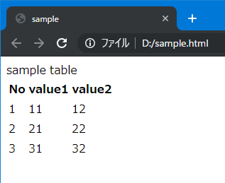 <th>No</th><th>value1</th><th>value2</th>