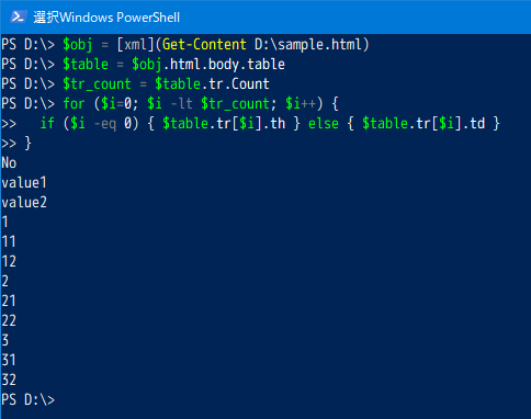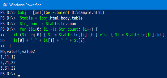 以下は、用意したsample.htmlをDドライブ直下に置いてPowerShellにて操作した実行例となります。
