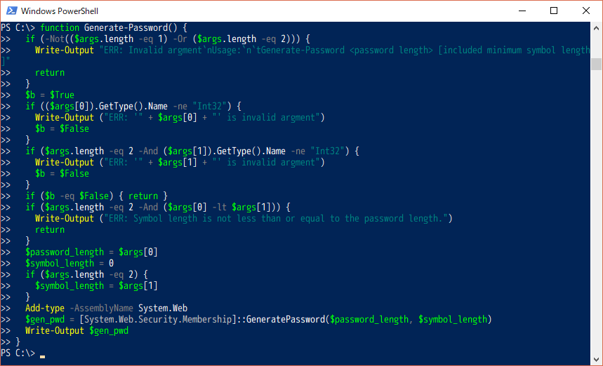 Generate-Password <password length> [included minimum symbol length]以上、PowerShellでランダムなパスワードを生成するサンプルスクリプトでした。