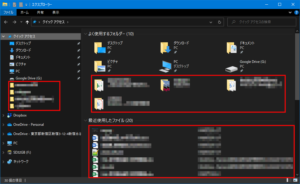 エクスプローラーのクイックアクセスに表示されているフォルダとファイルを削除する手順†