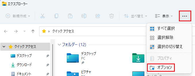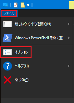 エクスプローラーの「ファイル」→「オプション」をクリックします。