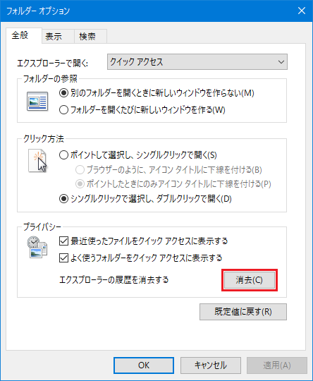 - 全般タブ、プライバシーの「消去」ボタンを押せば、「よく使用するフォルダー」「最近使用したファイル」が削除されます。