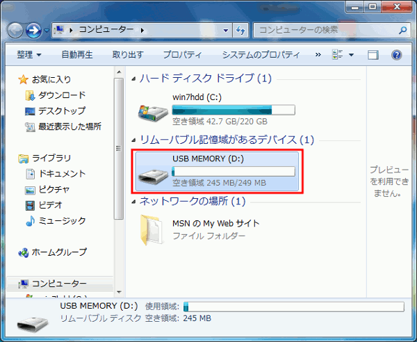 以下の手順は、Windows 7にUSBメモリを接続した状態です。