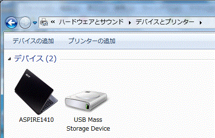「コントロールパネル」→「ハードウェアとサウンド」→「デバイスとプリンター」で確認したところ、USB Mass Storage Deviceが表示されているので認識はされているようです。