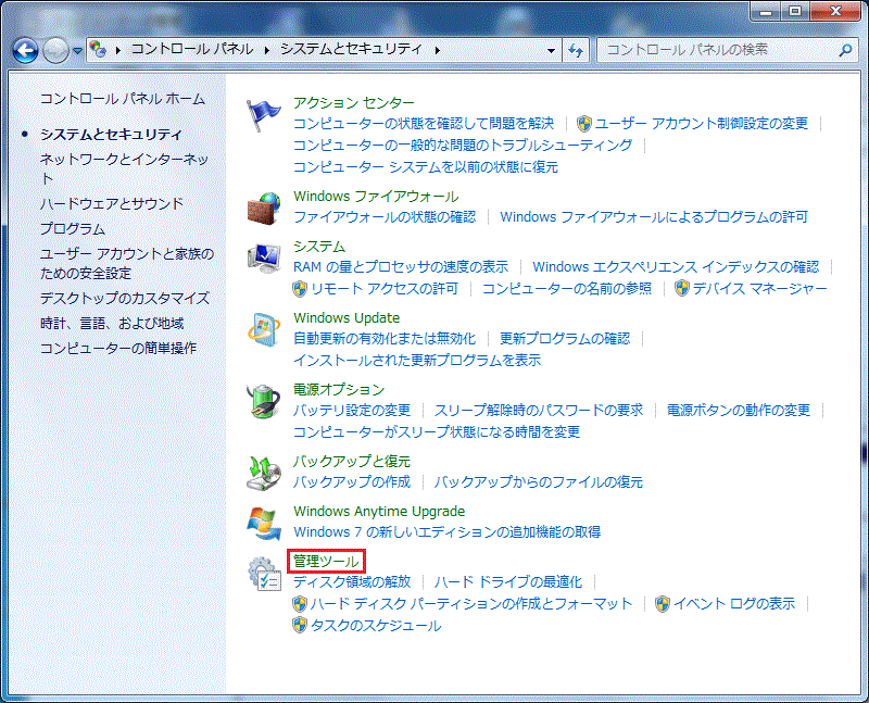 コントロールパネル→システムとセキュリティ→管理ツール