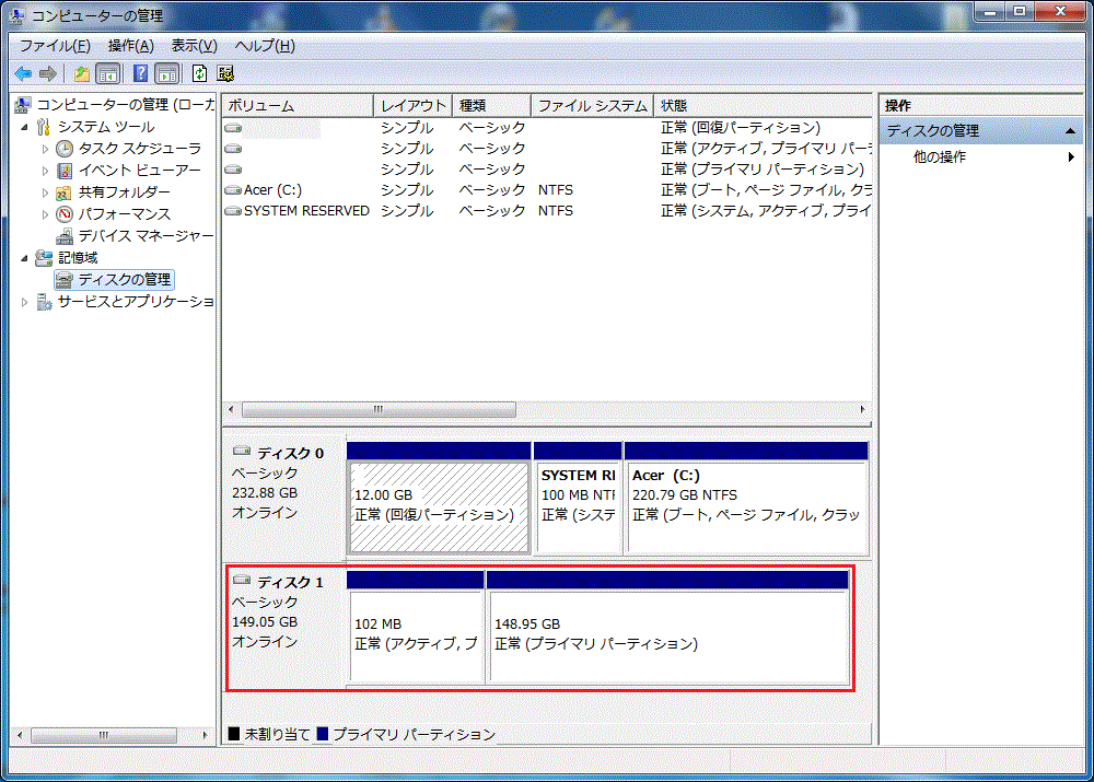 ディスク0はWindows7がインストールされているディスクなので触りません。