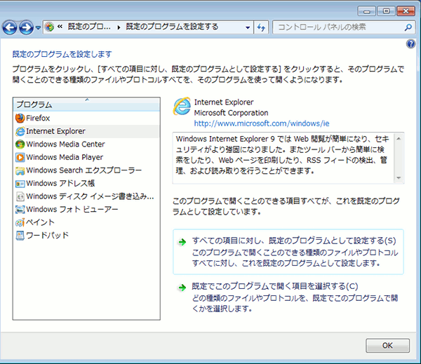 - Internet Explorerを既定のプログラムに変更するには、プログラムから既定のプログラムする行をクリックし、''すべての項目に対し、既定のプログラムとして設定する(S)をクリックします。