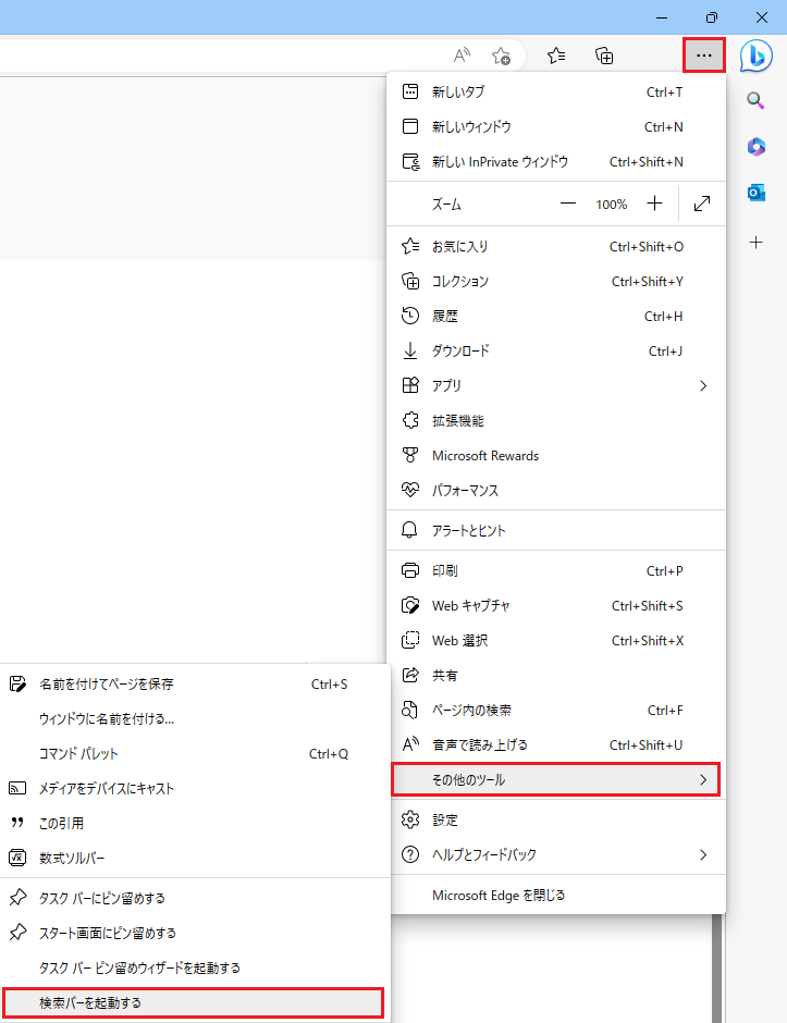 以下、Bing検索バーの再表示操作手順を以下に紹介します。