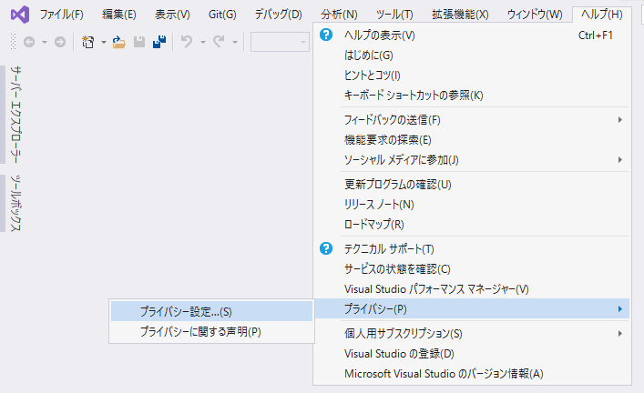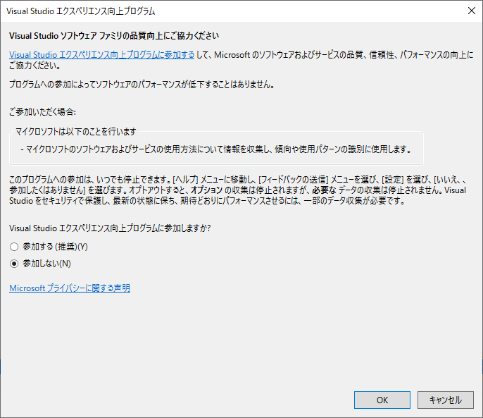 以下の手順で、「Visual Studio エクスペリエンス向上プログラム」を無効にします。