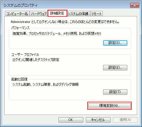 - 詳細設定タブの環境変数をクリック