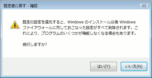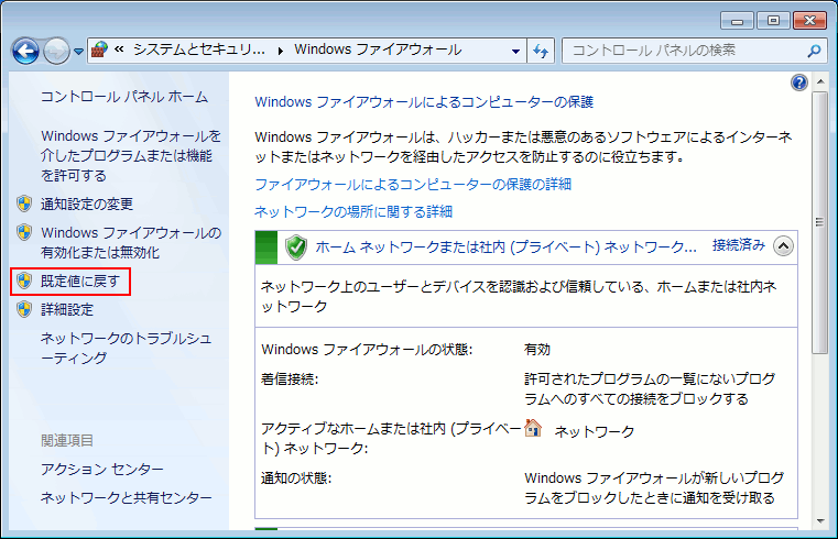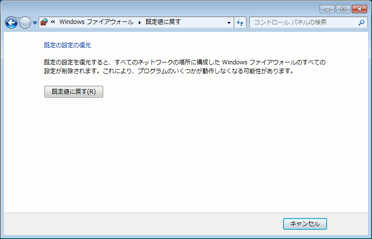 Windows7でファイアウォールの設定を初期化する操作手順を以下に記します。
