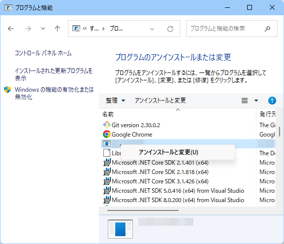 本記事の手順は、コントロールパネルからアンインストールを試すと