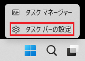 - 以下のメニューが表示されるので、「タスクバーの設定」をクリックします。