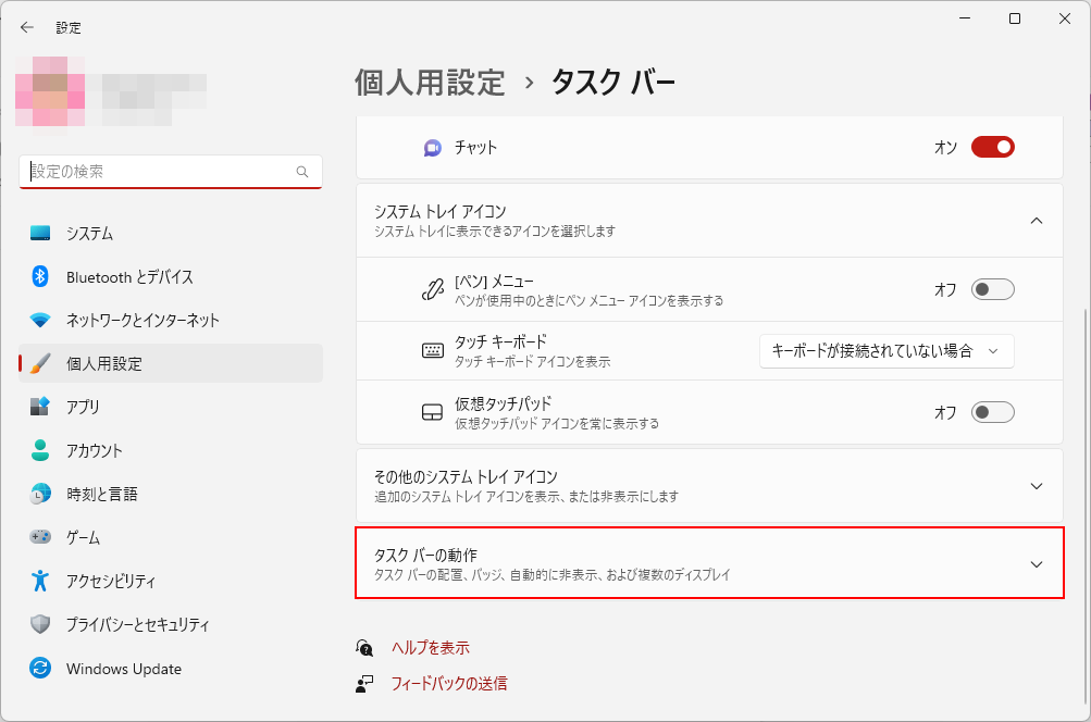 - タスクバーの設定が展開されます。