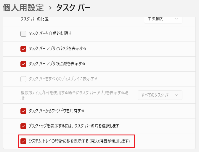 - システムトレイに時計に秒を表示する(電力消費が増加します)にチェックを入れます。