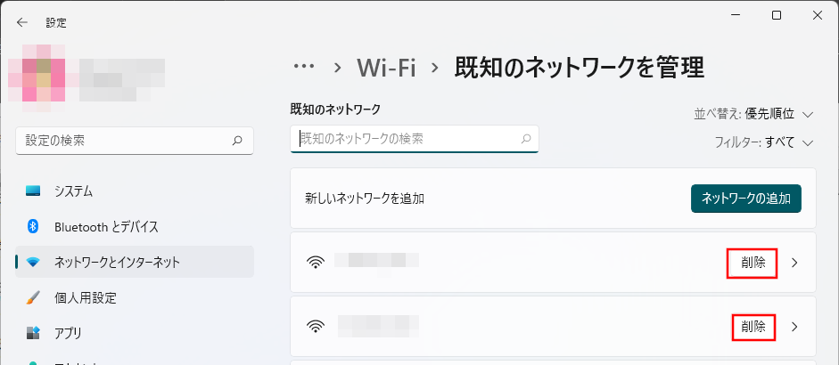 Windows11で設定したWi-Fiアクセスポイント設定の削除†