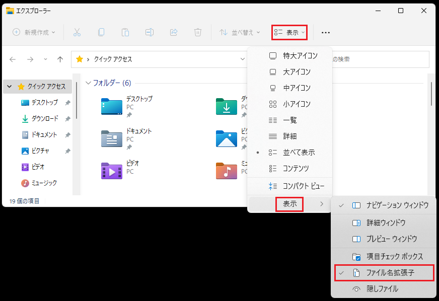 Windows11でファイルの拡張子を表示する操作手順を以下に記します。