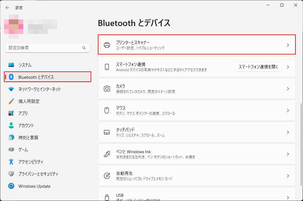 - 「Bluetooth とデバイス」をクリックし、「プリンターとスキャナー」をクリックします。