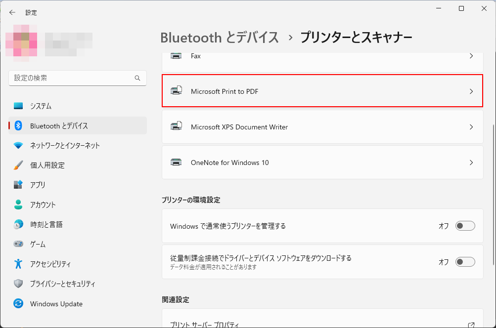 - 「プリンターの環境設定」の「Windowsで通常使うプリンターを管理する」が「オン」なっている場合は「オフ」にします。