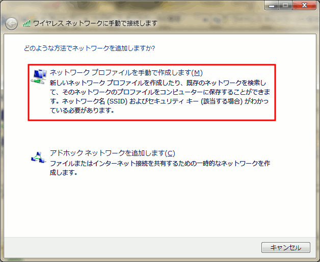 - ネットワークプロファイルを手動で作成します(M)をクリックします。