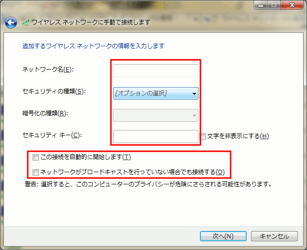 Windows7でステルスモードのSSIDの無線アクセスポイントに接続する手順†
