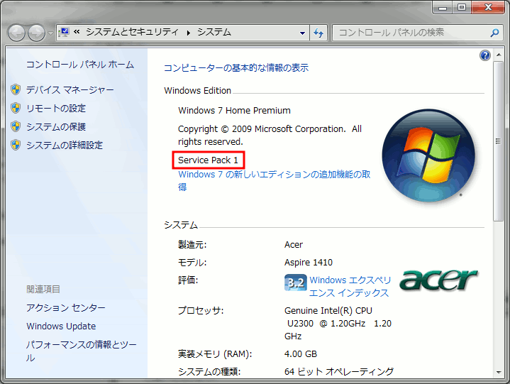Windows7にサービスパック(SP1)が適用されているか確認する手順†