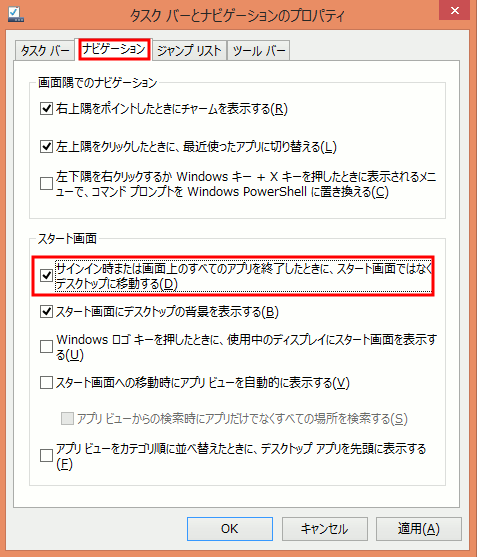 - サインイン時または画面上のすべてのアプリを終了したときに、スタート画面ではなくデスクトップに移動する(D)にチェックを入れます。